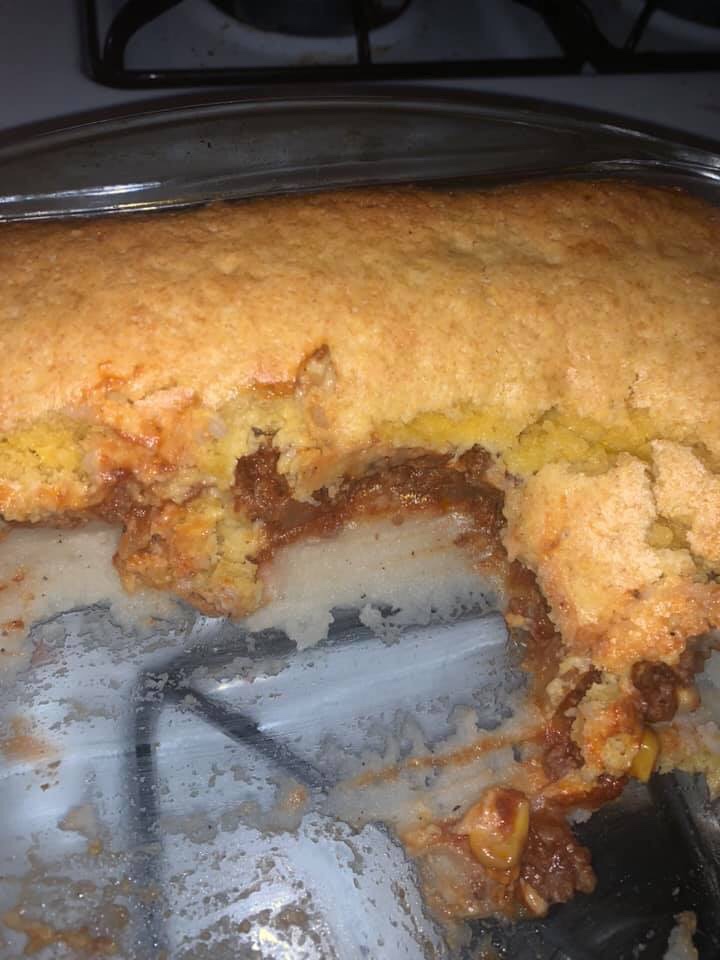 Spoon potatoes into the bottom of the dish and spread an even layer (about a inch or so think). Add the meat and vegetable mixture on top and spread. Then pour the cornbread batter over the top evenly, spread with a rubber spatula if needed. (NOTE: sometimes I do 16oz for a thicker layer of cornbread).